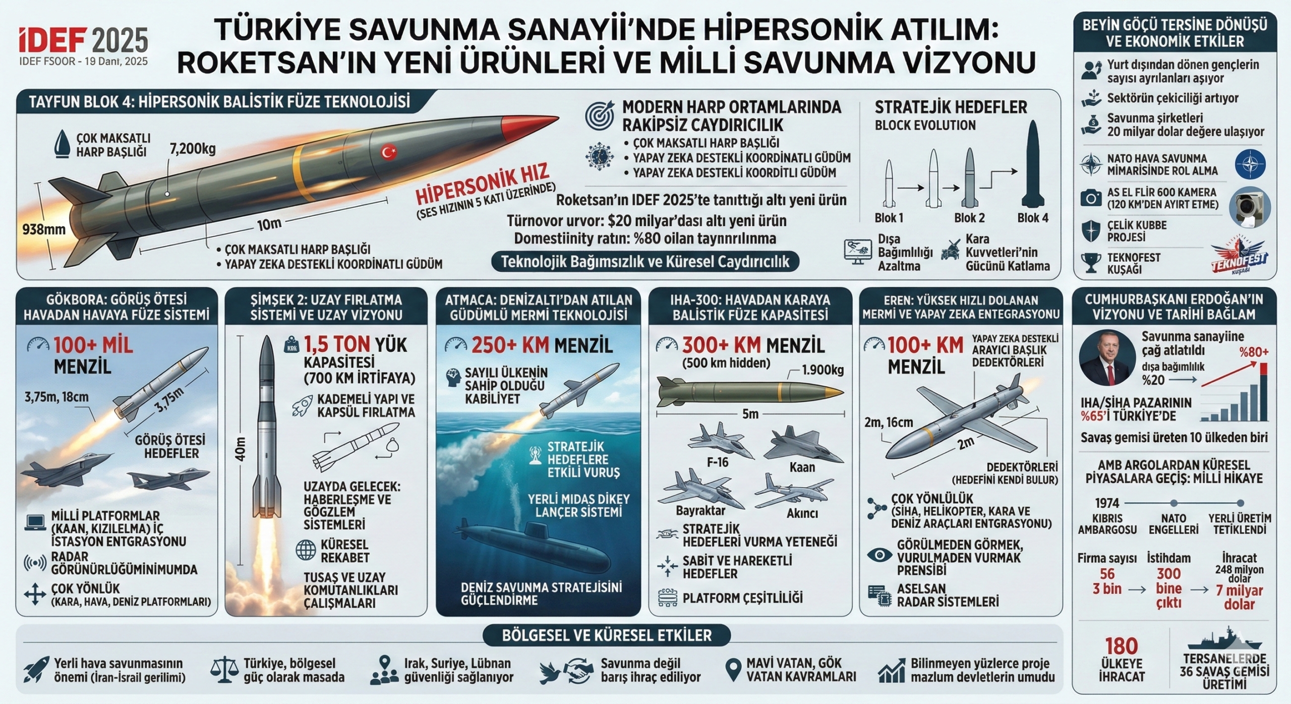 Anahtar kelimeler: Roketsan, Tayfun Blok 4, hipersonik füze, Gökbora, Şimşek 2, Atmaca, IHA-300, Eren, savunma sanayii, Cumhurbaşkanı Erdoğan, beyin göçü, yerlilik oranı, IDEF 2025, ASELSAN, Baykar, milli gurur
