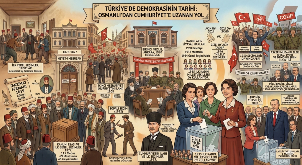 AnahtarKelimeler: TürkiyeDemokrasi, OsmanlıSeçimleri, TanzimatFermanı, MeşrutiyetDönemi, KanuniEsasi, BirinciMeclis, KadınHakları, TekPartiDönemi, ÇokPartiliHayat, AskeriDarbe, RefahPartisi, AKPYükselişi